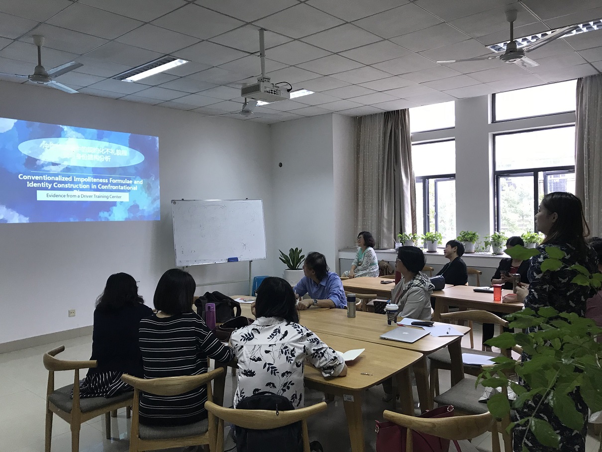 英语系的张玮老师就“冲突性话语与不礼貌身份建构分析”的主题进行分享。她结合驾校训练语料,首先从语用学角度阐释规约化不礼貌程式及其典型特征,然后讨论规约化不礼貌程式如何建构个人身份、关系身份与集体身份以及三者的动态关系,重点分析规约化不礼貌程式身份建构中体现的人际(不)和谐取向。研究发现,规约化不礼貌程式身份建构不仅可以呈现和谐挑战取向,也可以体现积极和谐取向,提升交际者之间的人际关系。